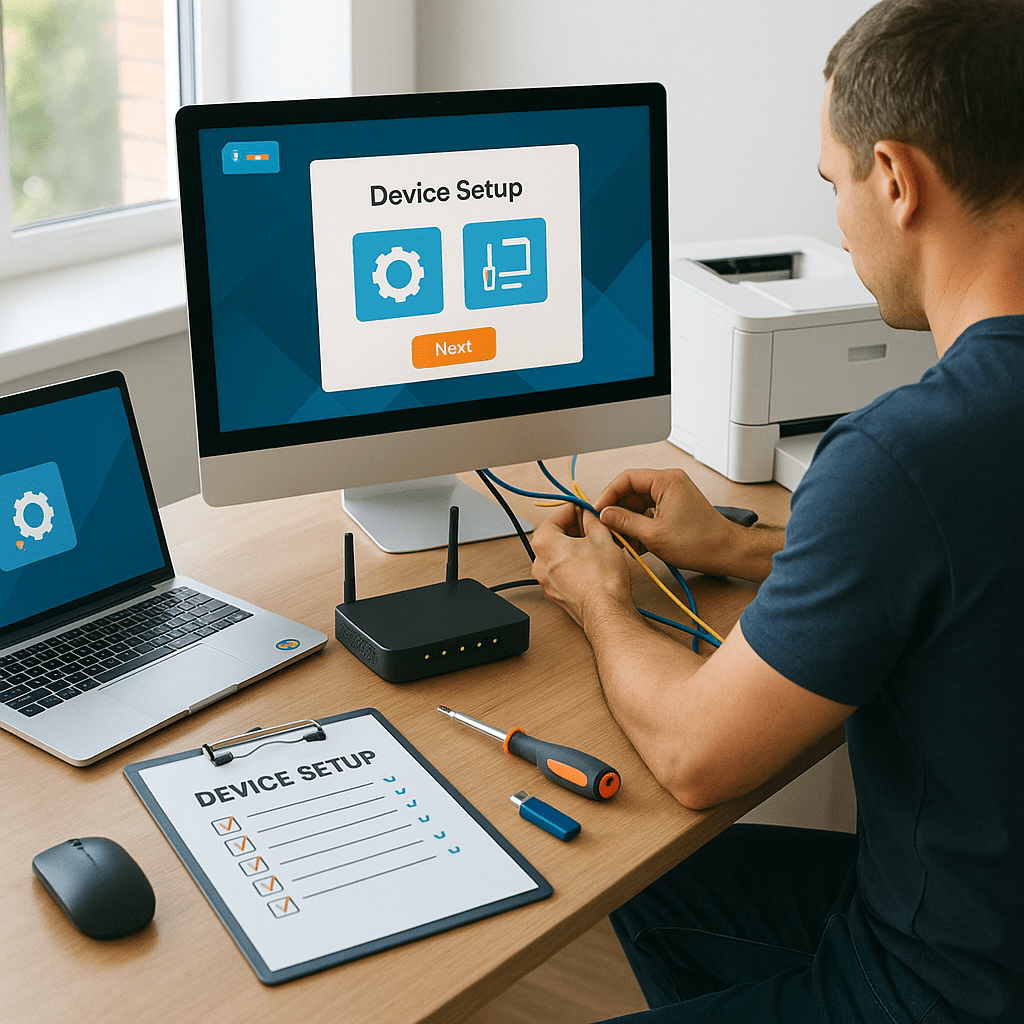 We handle the configuration of computers, tablets, printers, routers, and business apps so your workspace is ready to go — at the office or remote.